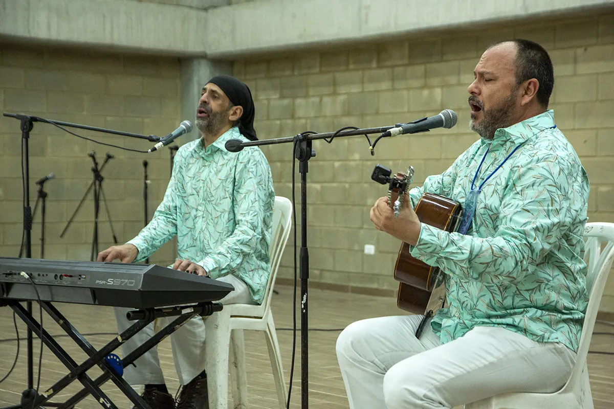 El “Dueto Primavera” de Boyacá presenta su repertorio en un Concierto Dialogado, explicando el uso de instrumentos autóctonos. Los asistentes se acercan, preguntan y descubren nuevas sonoridades que conectan con la raíz andina.
